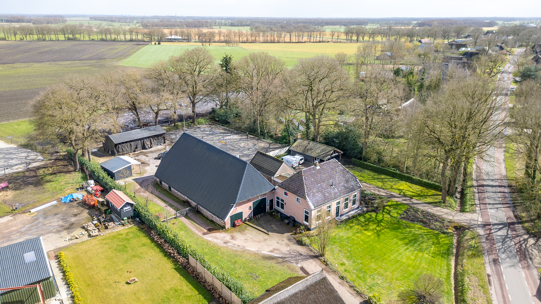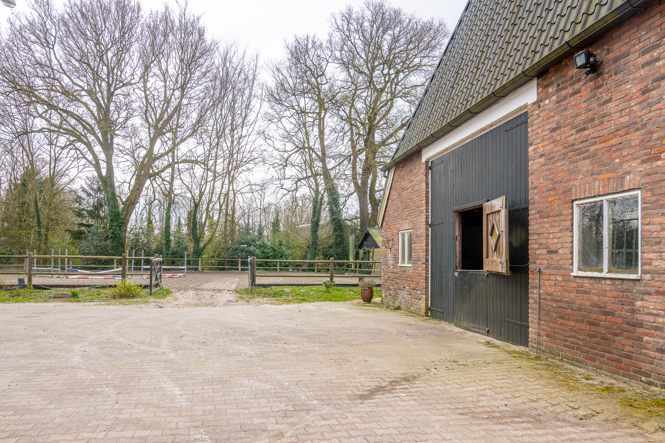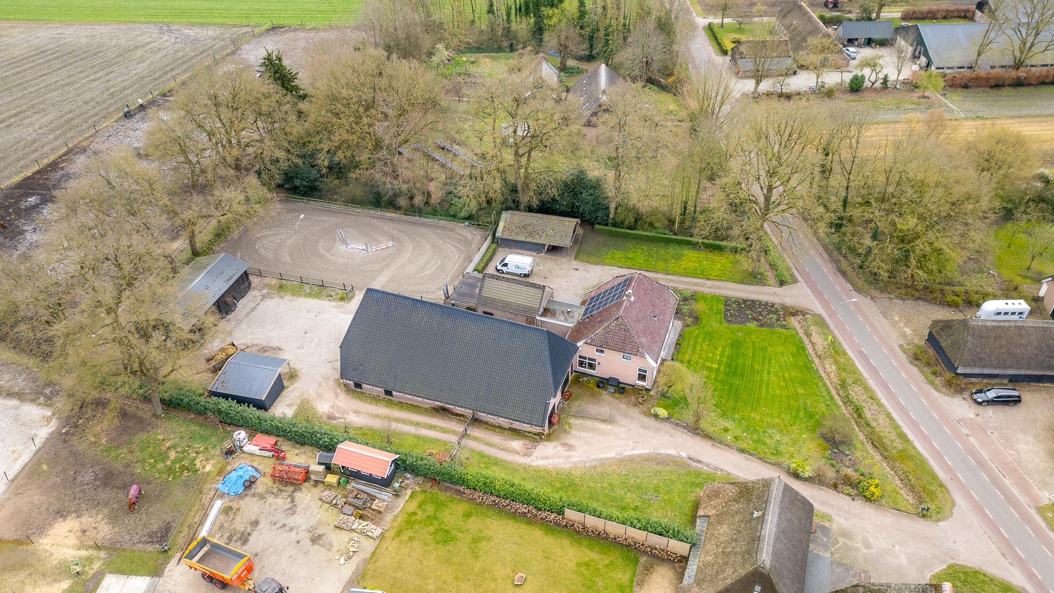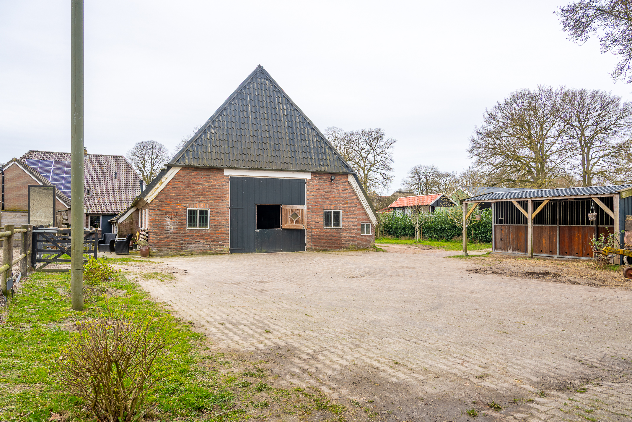 Deze half vrijstaande woonboerderij is gebouwd omstreeks 1927. In de loop van de jaren is er verbouwd en gemoderniseerd. De aangebouwde schuur (opp. ca. 239 m² en van binnenuit bereikbaar) bevat nu berging/stalling, paardenboxen, een wasplaats en zadelkamer. Er is een rijbak aanwezig, maar rijd je geen paard dan kan een tuin ook simpel worden aangelegd (zie foto’s). Het geheel ligt op een perceel van 2745 m².