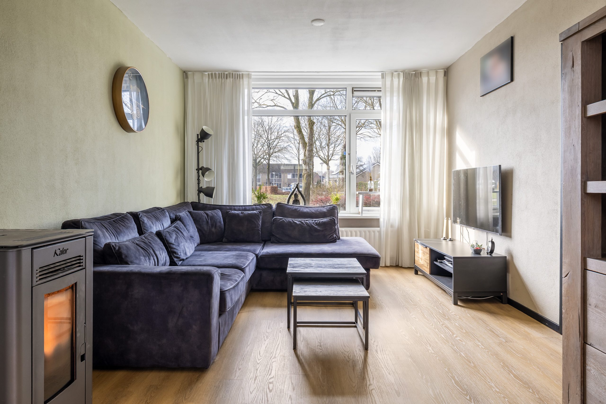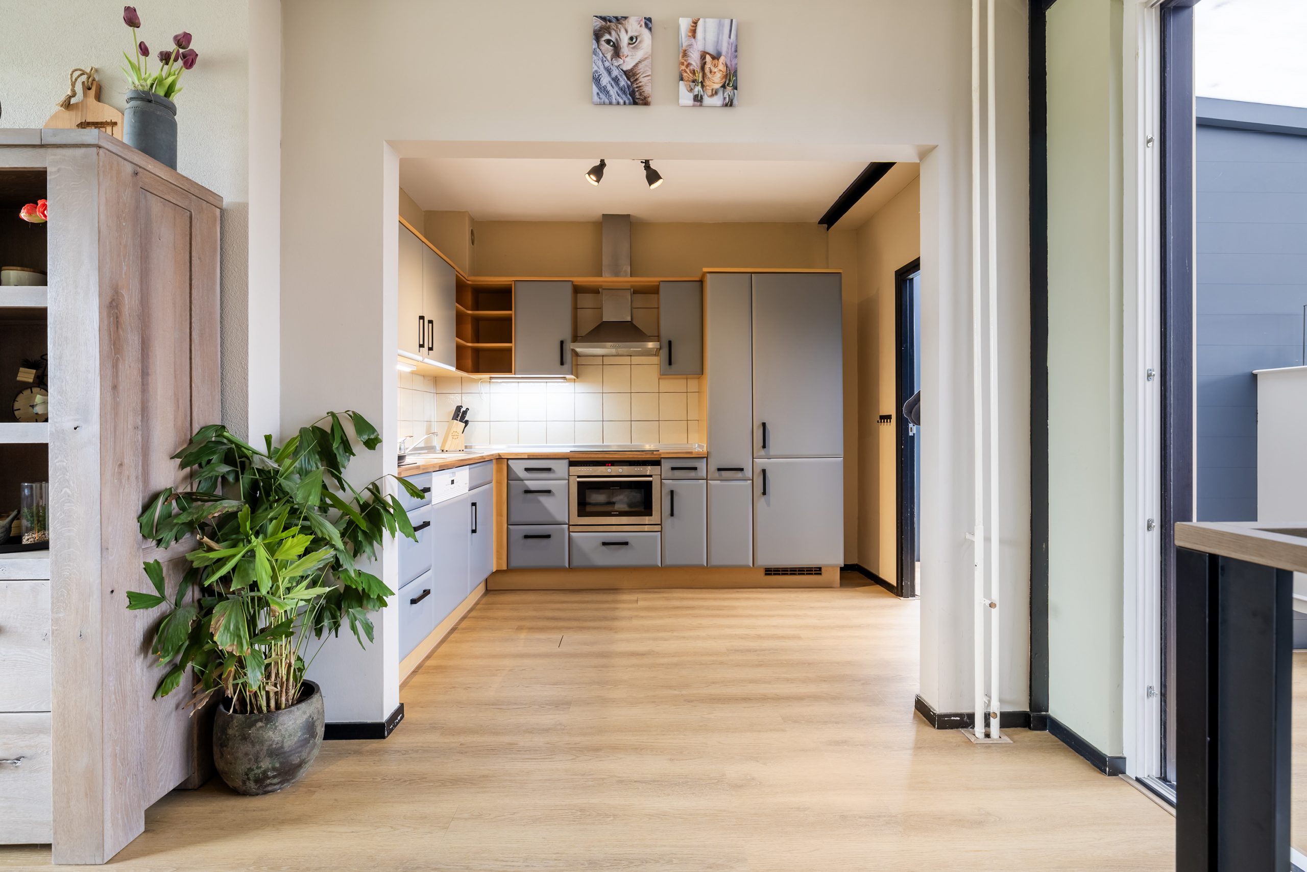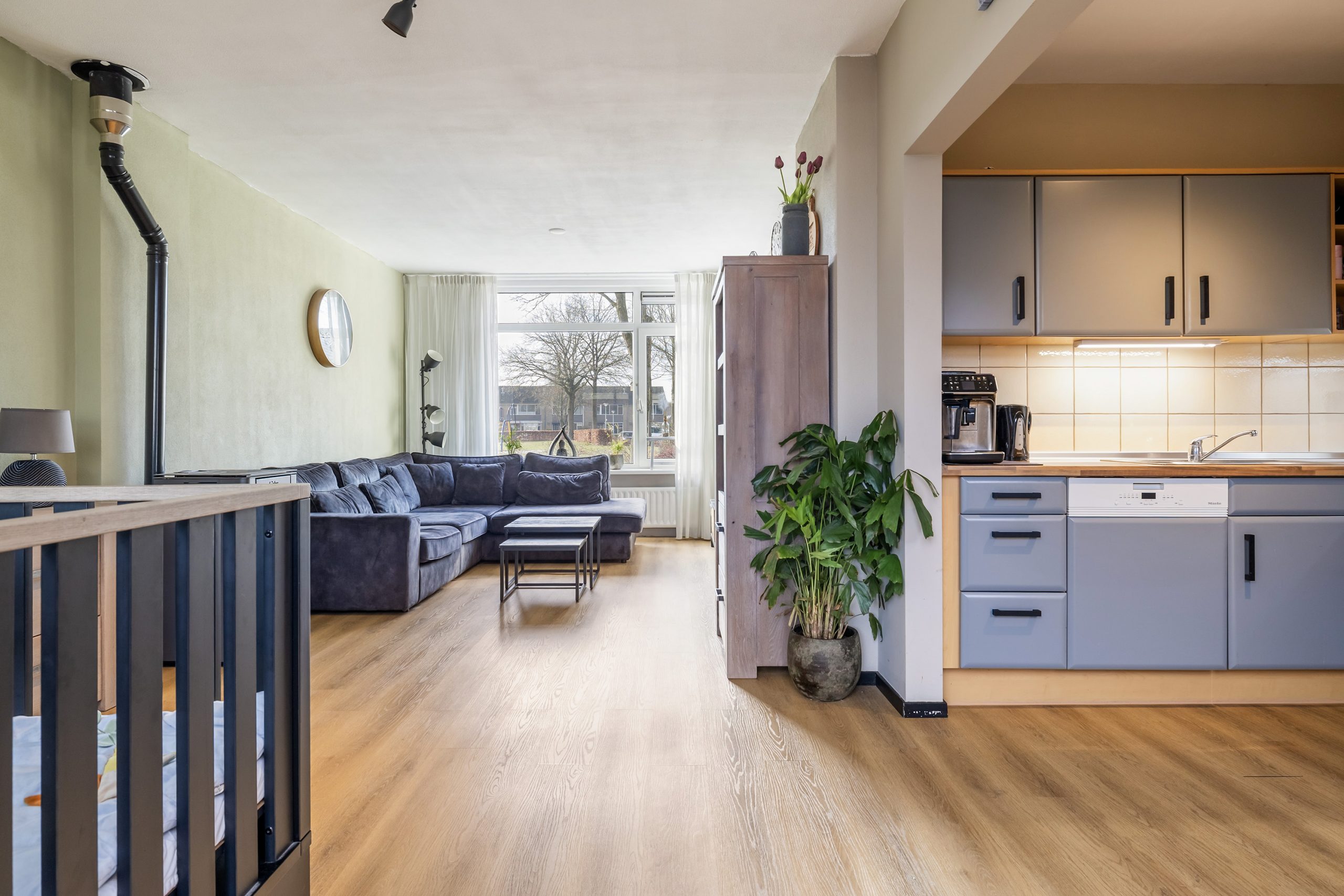 begane grond: entree met toilet, kelderkast, meterkast, doorzon woonkamer met pelletkachel en een schuifpui naar de tuinkamer/serre (2021) met schuifpui naar de tuin, keurige keuken in hoekopstelling en v.v. vaatwasser (2021), koelkast, inductie kookplaat (2021), combi- magnetron, toegang tot de bijkeuken/berging/achterentree. Vanuit de woonkamer zicht op groenstrook/speelveld.