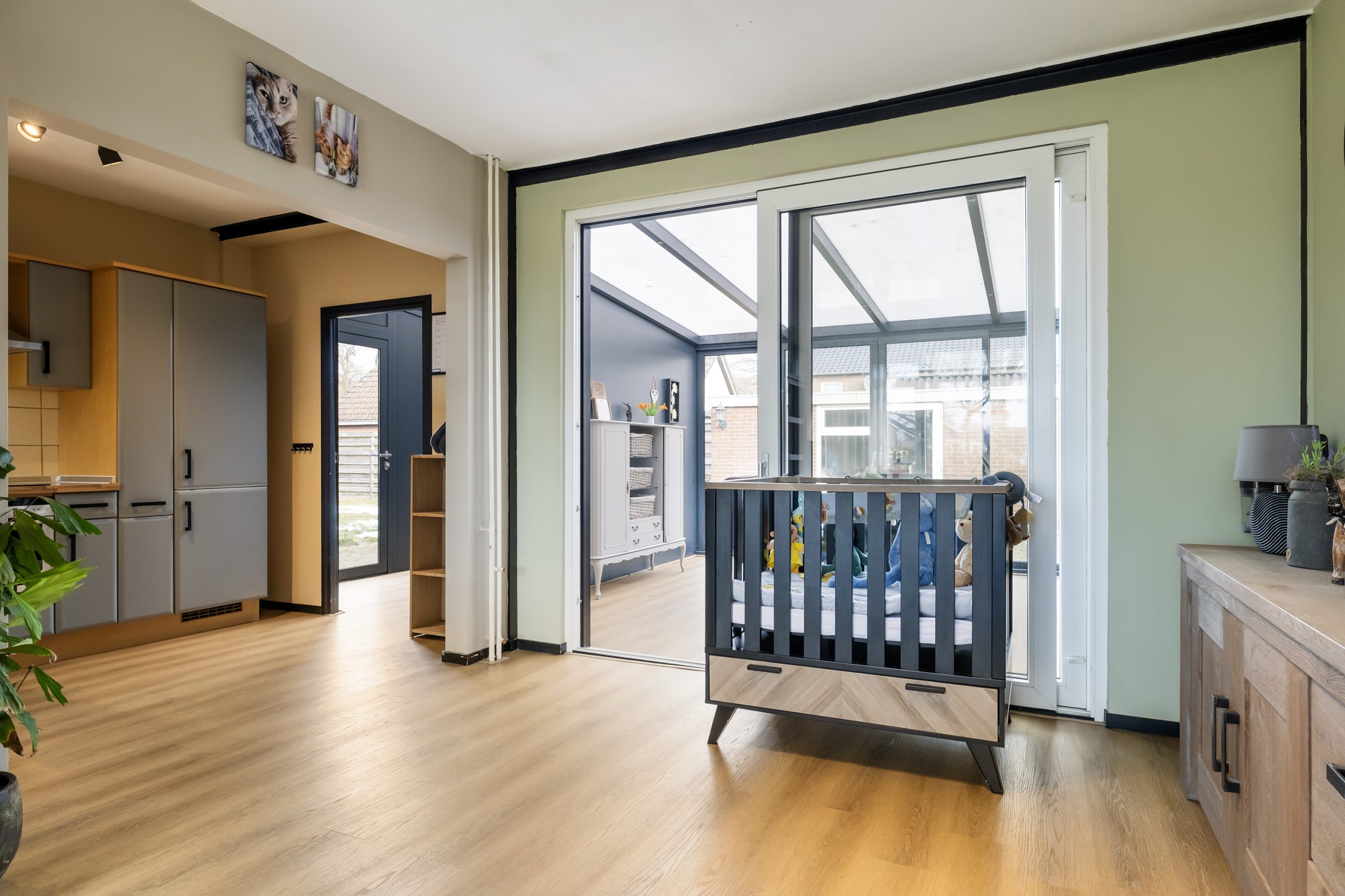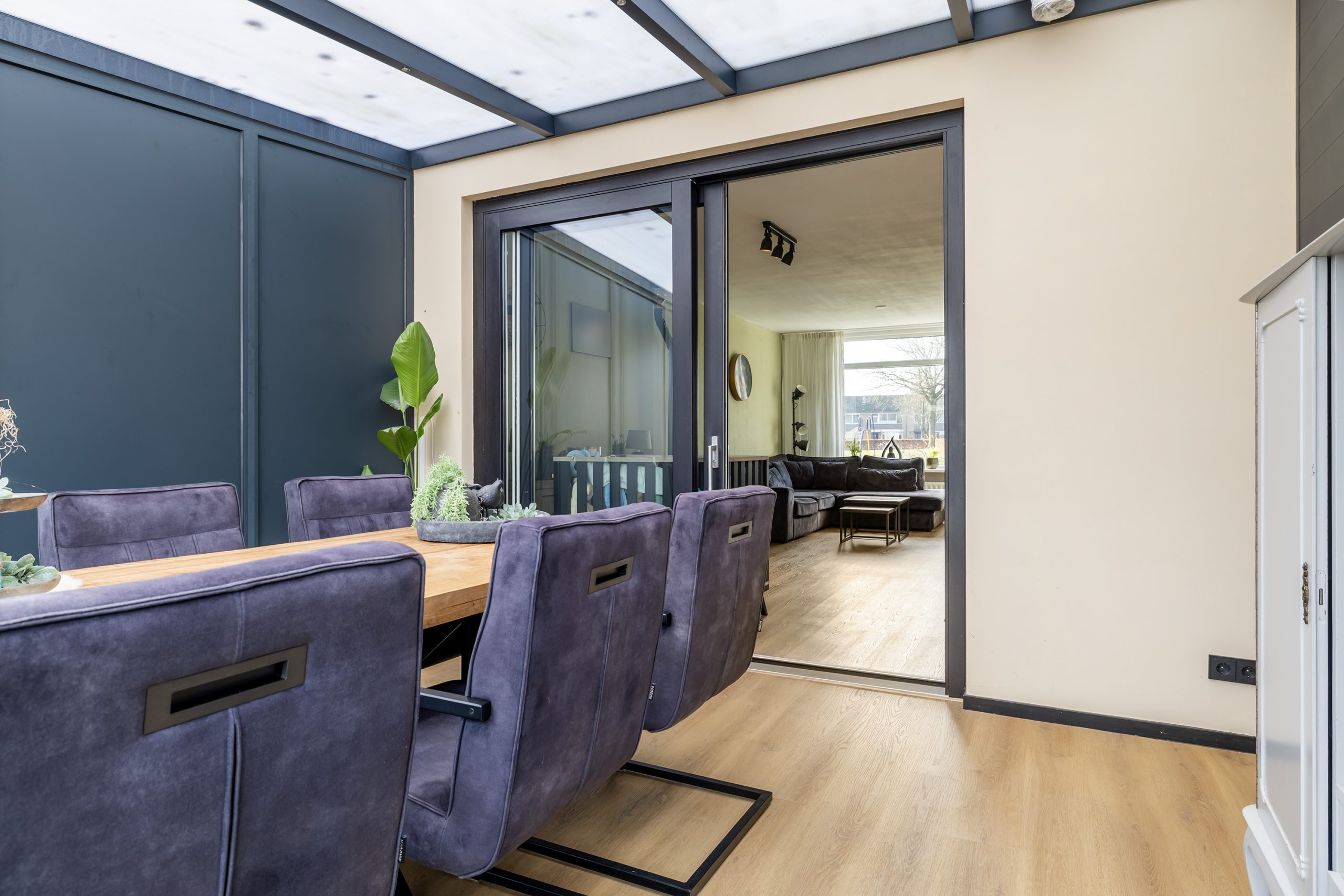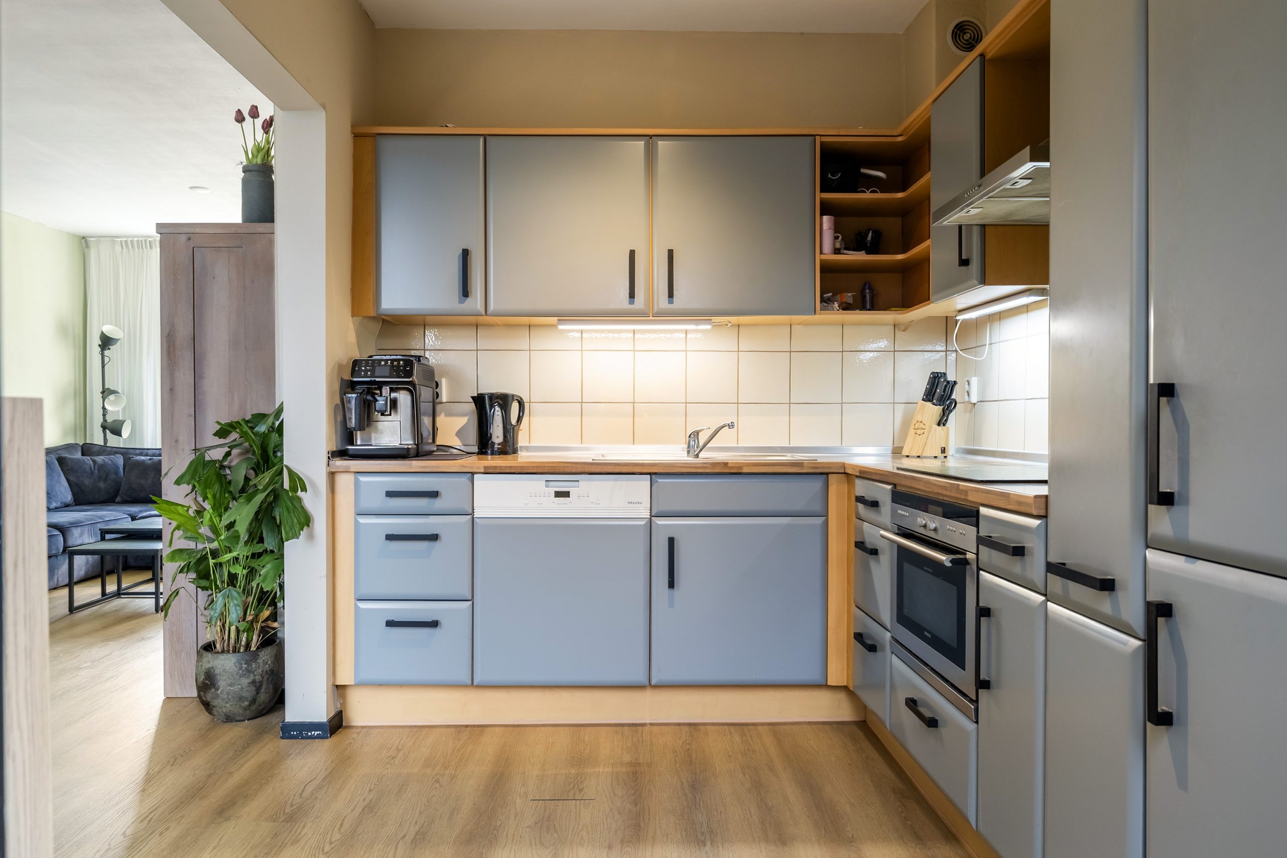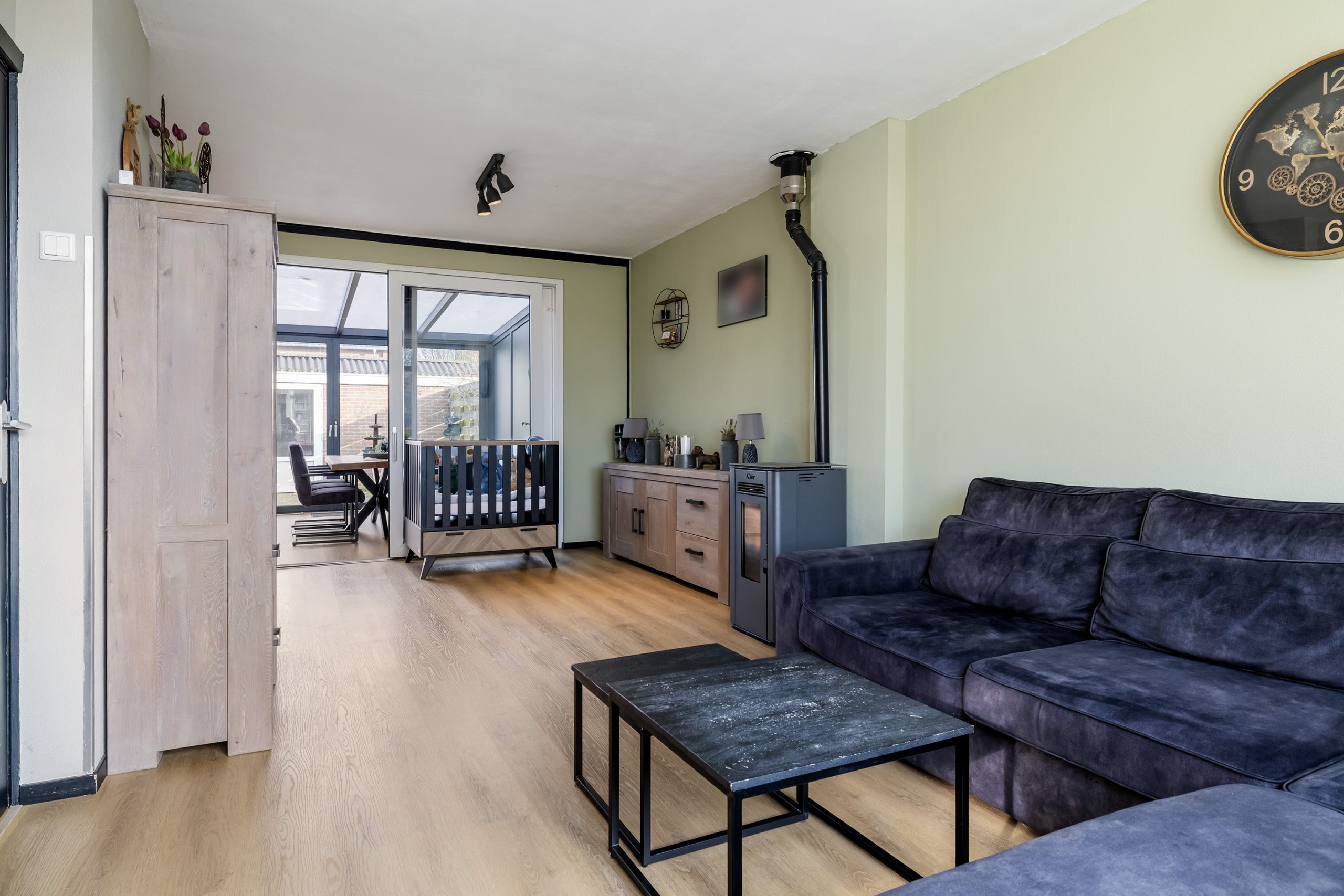 begane grond: entree met toilet, kelderkast, meterkast, doorzon woonkamer met pelletkachel en een schuifpui naar de tuinkamer/serre (2021) met schuifpui naar de tuin, keurige keuken in hoekopstelling en v.v. vaatwasser (2021), koelkast, inductie kookplaat (2021), combi- magnetron, toegang tot de bijkeuken/berging/achterentree. Vanuit de woonkamer zicht op groenstrook/speelveld.