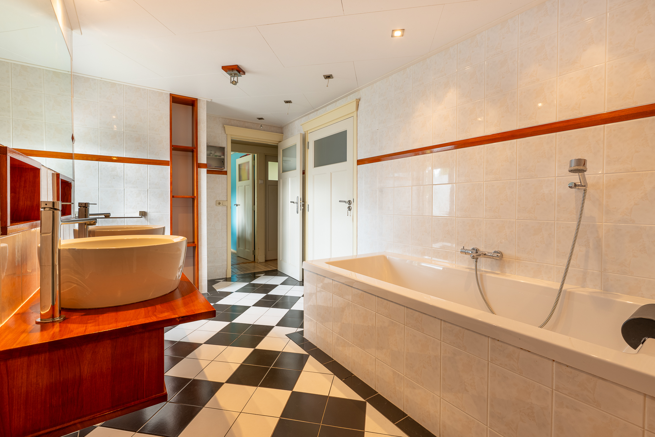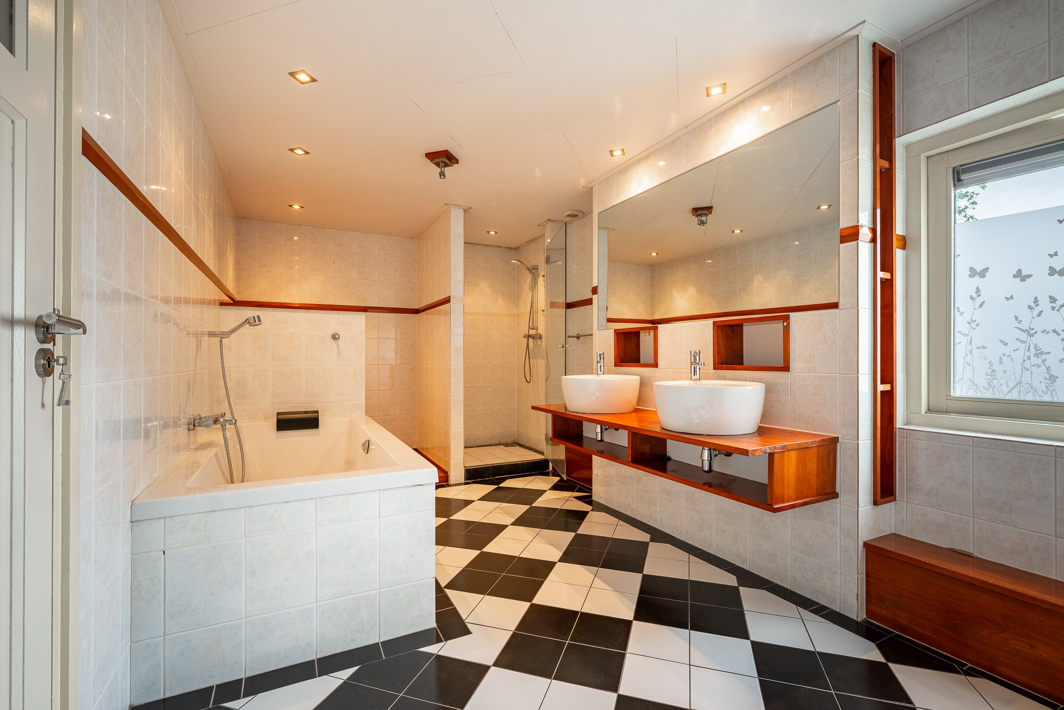 Wij gaan u hierna door de woning loodsen: via de voordeur kom je in de hal met trapopgang en toegang tot ruime toilet met hangcloset, urinoir en wastafel, via een dubbele glasdeur is er direct zicht op het woongedeelte, met eethoek bij de keuken en verder voldoende ruimte voor speelse invulling van de kamer vanuit de kamer nog een dubbele deur naar het terras. Aansluitend aan de keuken is een ruime slaapkamer gebouwd met eigen douche en kleedruimte. Via de bijkeuken kom je in de garage/berging. Vanuit de hal/entree met de trap naar boven waar nog 3 slaapkamers zijn en waarvan 1 zeer riant is en aansluitend een berging/kleedkamer heeft. Daarnaast boven nog een grote badkamer met ligbad, douchecabine, dubbele wastafel en toilet.